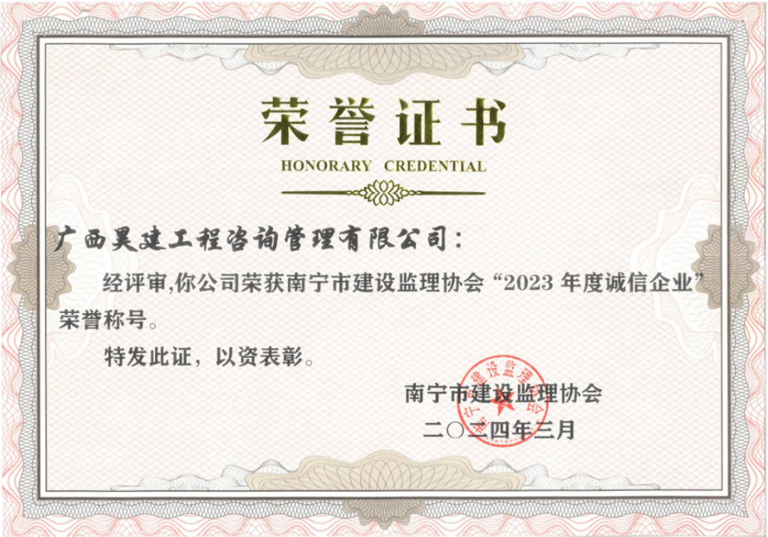近日,南宁市建设监理协会对2023年度诚信企业、南宁市先进监理单位和优秀个人进行表彰,昊建咨询榜上有名,荣获“2023度诚信企业”、南宁市“先进监理单位”称号,公司共10人获评“优秀总监理工程”“优秀监理工程师”荣誉称号。