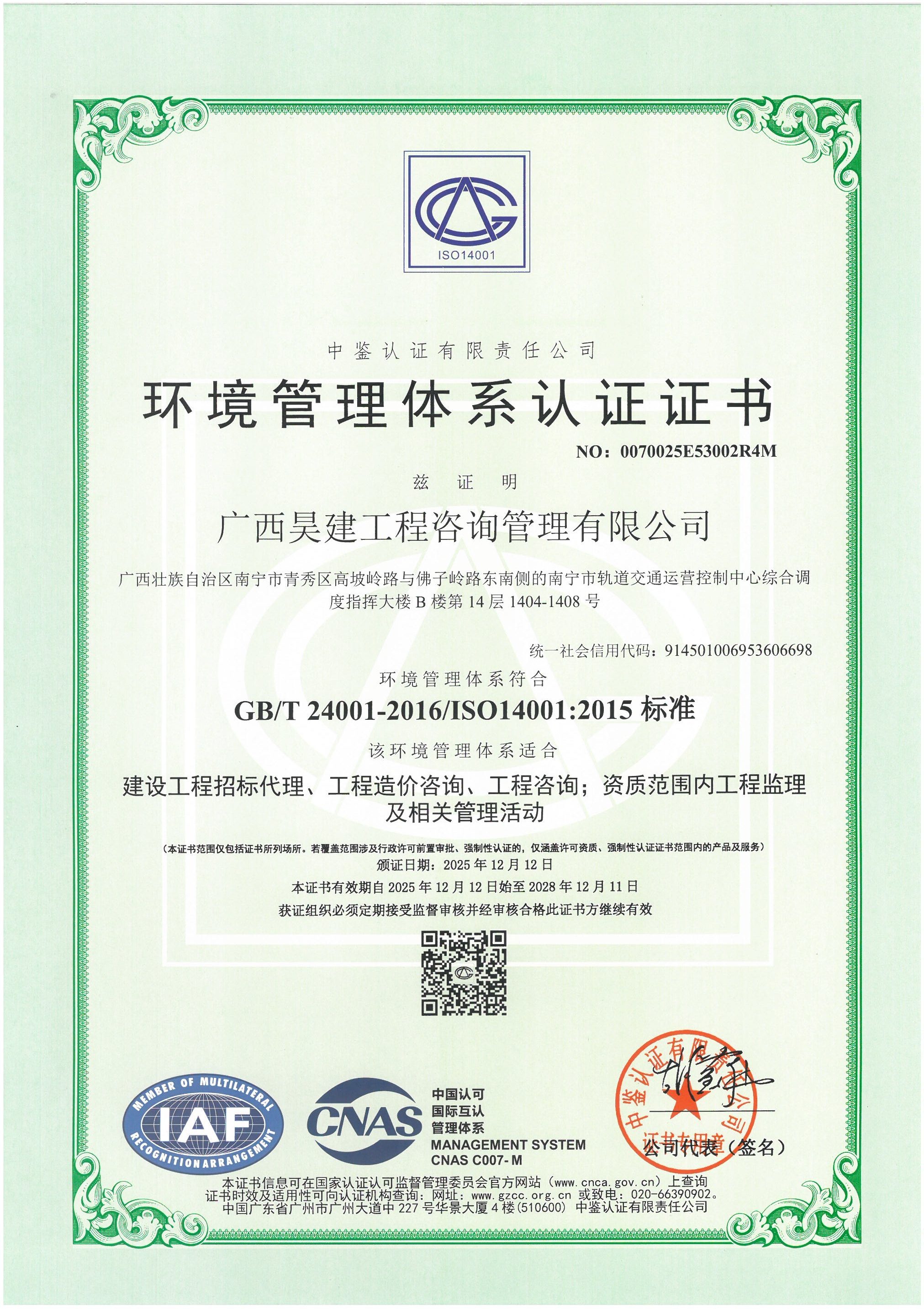 环境管理体系认证证书
