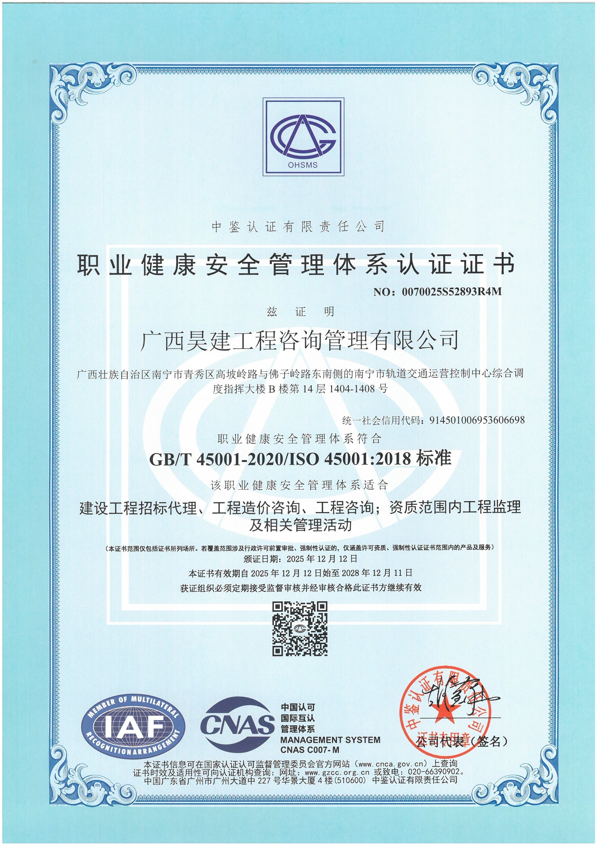 职业健康安全管理体系认证证书