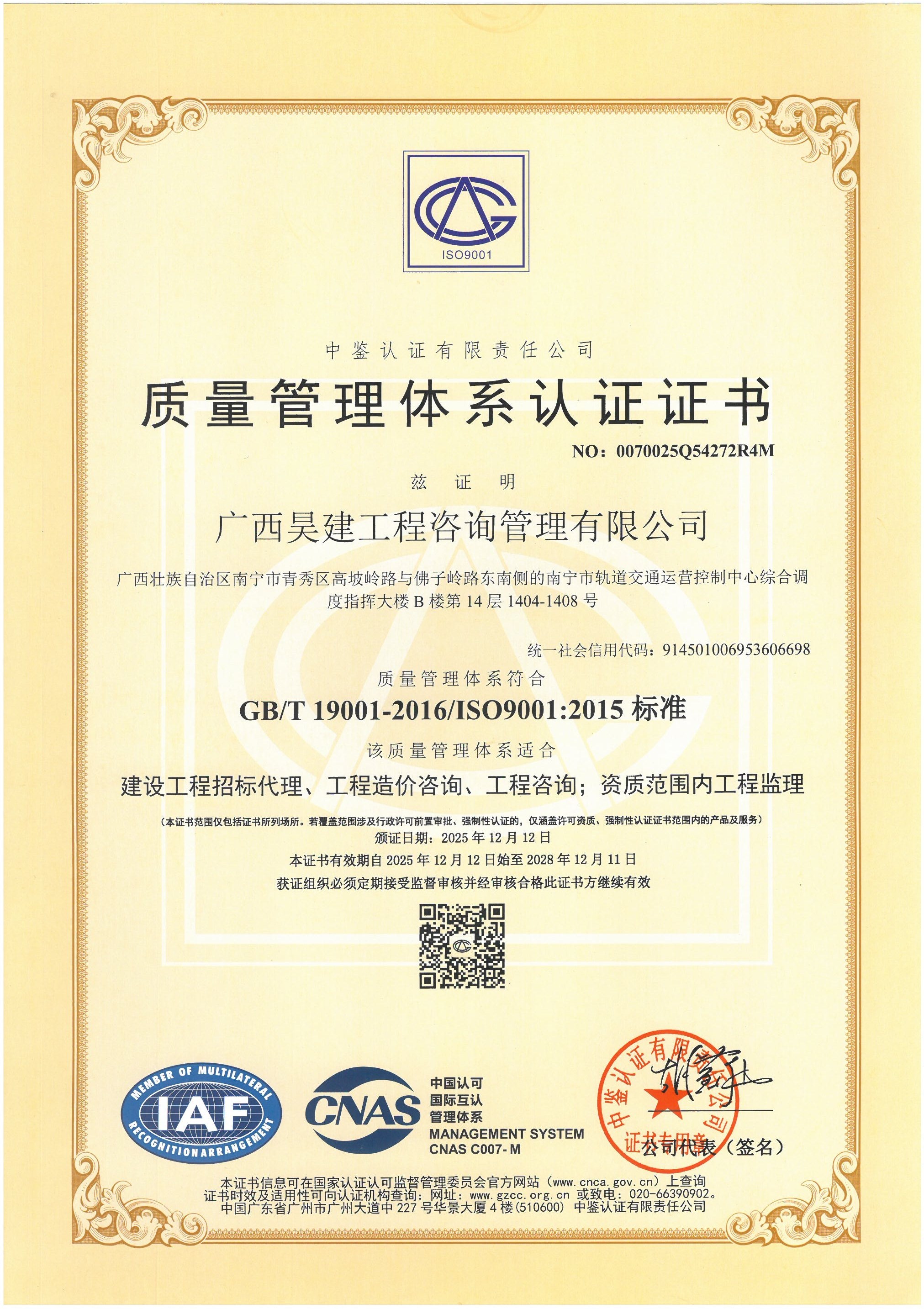 质量管理体系认证证书
